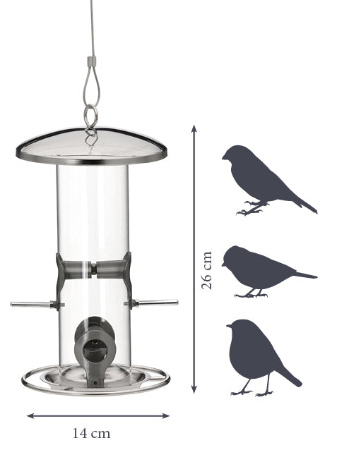 XXL-Futtersäule aus Metall mit Acrylglassilo und Futtertablett für Nüsse, Körner und Sämereien