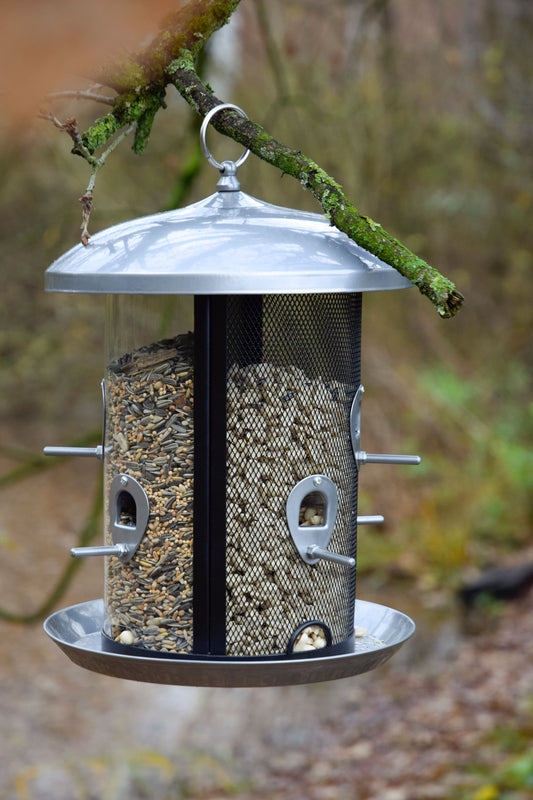 Multifunktions-Futtersäule aus Stahl mit Acrylglassilo und Meisenknödelhalter