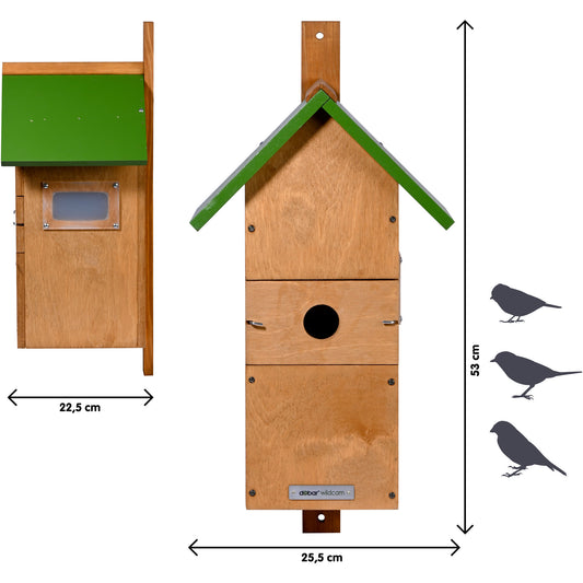 Beobachtungsnistkasten "Einblick" – Nistkasten mit Spiegel und austauschbaren Einfluglöchern, wetterfestes Kiefernholz
