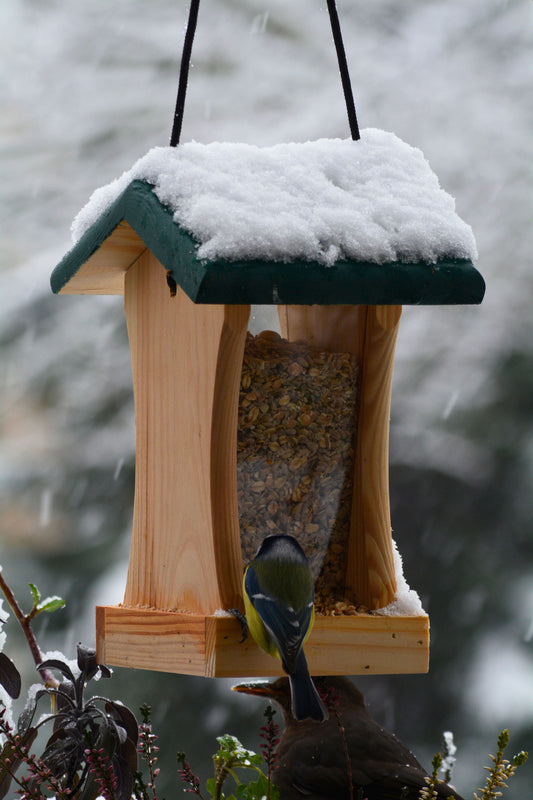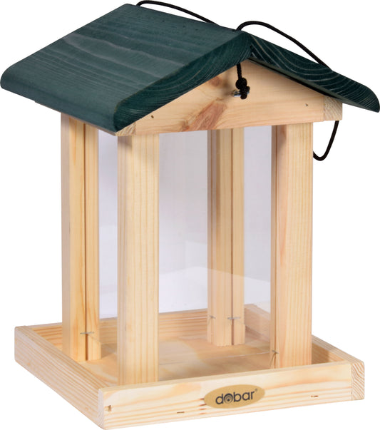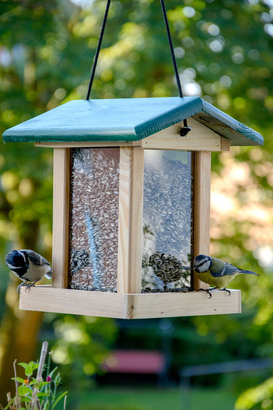 Kompakte Vogelfutterstation aus Kiefernholz mit Acrylglasschutz und grünem Dach