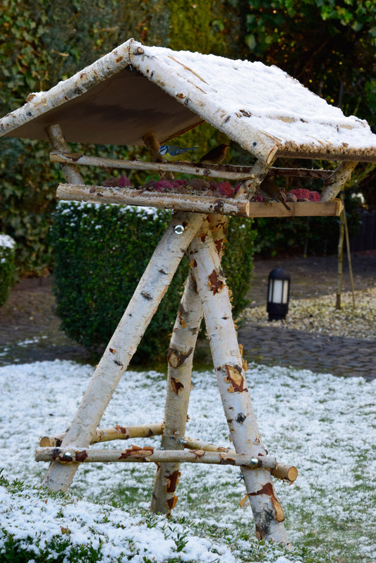 XXL Vogelfutterstation - Naturbelassenes Birkenholz, Schilfdach, witterungsbeständig, mit Ständer