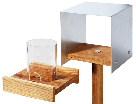 Design-Vogelfutterhaus "Bauhaus II" - Eichenholz, Aluminiumdach, Acrylglassilo, wetterfest, mit Ständer