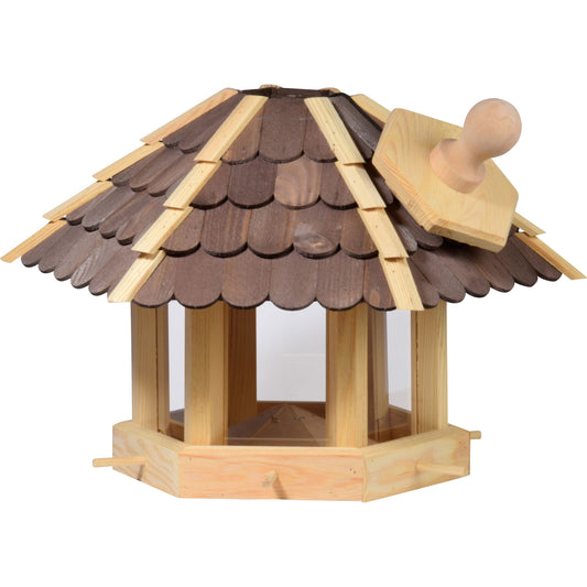 Traditionelles Vogelfutterhaus aus wetterfestem Kiefernholz mit braunem Schindeldach