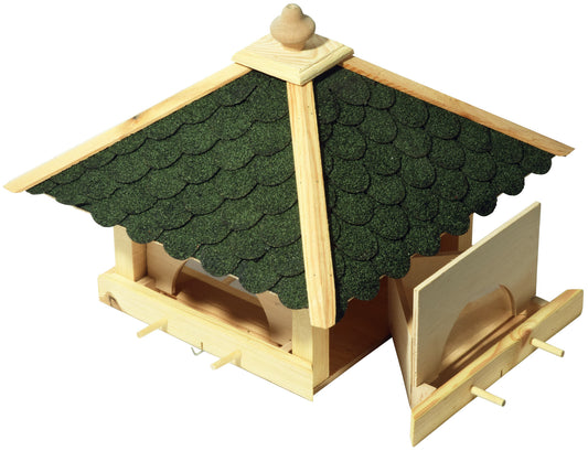 XL Vogelvilla aus Massivholz mit Futterschubladen - Großes Vogelfutterhaus mit grünem Bitumendach