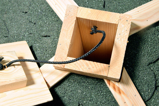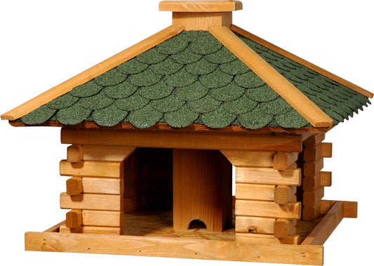 Quadratisches Vogelhaus im Blockhaus-Stil – Rustikales XL Vogelfutterhaus mit grünem Bitumenschindeldach und Futtersilo