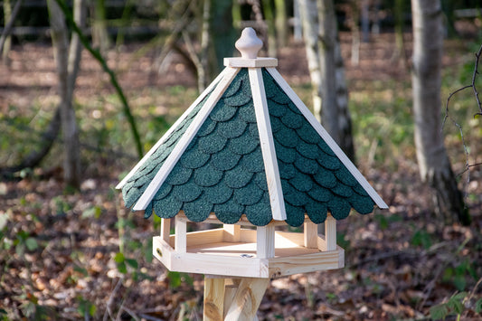 Großes sechseckiges Vogelhaus mit grünem Bitumendach – Traditionelle Vogelfutterstation aus massivem Kiefernholz