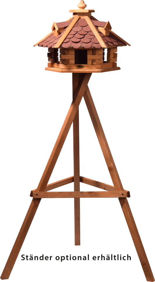 Sechseckiges Vogelhaus mit rotem Bitumenschindeldach – Massives Vogelfutterhaus mit Futtersilo
